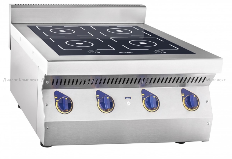 Четырехконфорочная индукционная плита КИП-47Н для приготовления первых, вторых и третьих блюд в наплитной посуде. Используемая посуда должна обладать магнитными свойствами (к ней должен притягиваться магнит) и иметь плоское дно. Может использоваться посуда из нержавеющей стали или алюминия с ферромагнитным дном, чугунная посуда. - стеклокерамическая рабочая поверхность толщиной 6 мм; - полностью из нержавеющей стали; - четыре зоны нагрева; - два индукционных модуля E.G.O.(Германия); - плавная регулировка температуры нагрева от 60 до 240 °С (значения мощности нагрева от "1" до "9"); - режим увеличенной мощности - BOOST; - в обычном режиме при работе всех четырех конфорок потребляемая мощность каждой конфорки - 1,75 кВт, потребляемая мощность плиты - 7 кВт (4 х 1,75 кВт); - в обычном режиме при работе одной конфорки из своей пары ее потребляемая мощность - 2,1 кВт, потребляемая мощность плиты - 4,2 кВт (2 х 2,1 кВт); - в режиме BOOST при работе одной конфорки из своей пары ее потребляемая мощность - 3,5 кВт, п