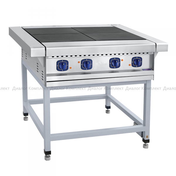 Плита электрическая четырехконфорочная без жарочного шкафа ЭП-4П на подставке предназначена для приготовления первых, вторых, третьих блюд в наплитной посуде, а также для жарки полуфабрикотов из мяса, рыбы, овощей и выпечки мелко штучных кулинарных изделий. Основные характеристики ЭП-4П - чугунные конфорки 295x417 мм; - мощность каждой конфорки 3 кВт; - разогрев до +480 °C за 30 минут; - 4-х позиционные переключатели; - подставка из окрашенного металла; - регулируемые по высоте ножки.