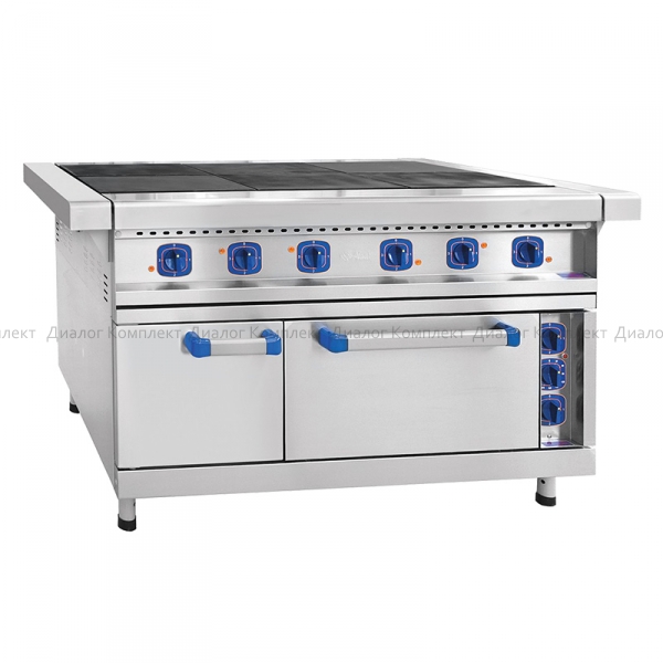 Плита электрическая шестиконфорочная с жарочным шкафом ЭП-6ЖШ-01 предназначена для приготовления первых, вторых, третьих блюд в наплитной посуде, а также для жарки полуфабрикотов из мяса, рыбы, овощей и выпечки мелко штучных кулинарных изделий. ОСНОВНЫЕ ХАРАКТЕРИСТИКИ ЭП-6ЖШ-01 - чугунные конфорки 295х417 мм; - все регуляторы расположены на передней панели: - 4-х позиционное исполнение регуляторов; - мощность каждой конфорки 3,0 кВт; - разогрев до +480 °C за 30 минут; - внутренние размеры жарочного шкафа - 538x535x290 мм; - материал изготовления жарочного шкафа - нержавеющая сталь; - в комплекте 3 противня 530x470x30 мм из углеродистой стали; - диапазон регулирования температуры жарочного шкафа +20...+270 °C; - разогрев жарочного шкафа до +240 °C за 30 минут; - аварийный терморегулятор от перегрева +320 °C; - раздельная регулировка мощности верхнего и нижнего блоков ТЭНов; - регулируемые по высоте ножки.