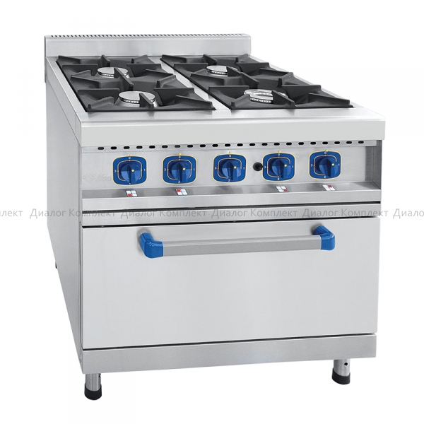 Газовая плита четырехгорелочная с духовкой (газовой) ПГК-49ЖШ. Предназначена для приготовления первых, вторых и третьих блюд в наплитной посуде, а также для жарки полуфабрикатов из мяса, рыбы, овощей и выпечке мелкоштучных кулинарных изделий. Плита имеет три горелки по 5,5 кВт и одну мощную горелку - 7,5 кВт. Плита снабжена системой поджига и устройством "газ-контроль". Внизу - жарочный шкаф с одним противнем GN 2/1 и одной решеткой того же размера, изготовленные из нержавеющей стали. Рабочий диапазон температуры духовки 120-3200 С. Плита имеет регулируемые по высоте ножки. В комплект поставляются дополнительные съемные форсунки под "сжиженный газ".