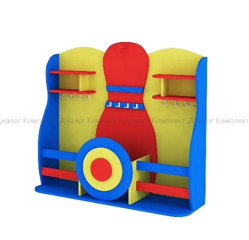 Красочный спортивный уголок Кегля – это отличный вариант для оснащения детского сада! Цветовой конструкторский дизайн придётся по душе ребятам! Уголок оборудован вместительным ящиком для мячей, полками, несколькими маленькими крючками для ленточек и скакалок. Так же есть один большой крючок для обручей. Крышка ящика имеет форму круга с нанесённым рисунком в виде мишени. Мебель имеет специальные колёсики, что поможет перемещению по спортивному залу. Изготовлен из прочной и устойчивой ЛДСП, окрашенной яркими нетоксичными красками. Товар безопасен при эксплуатации: острые углы отсутствуют, а крепёжные элементы надёжно скрыты. Соответствует предъявляемым требованиям и параметрам. Транспортируется в разобранном виде.